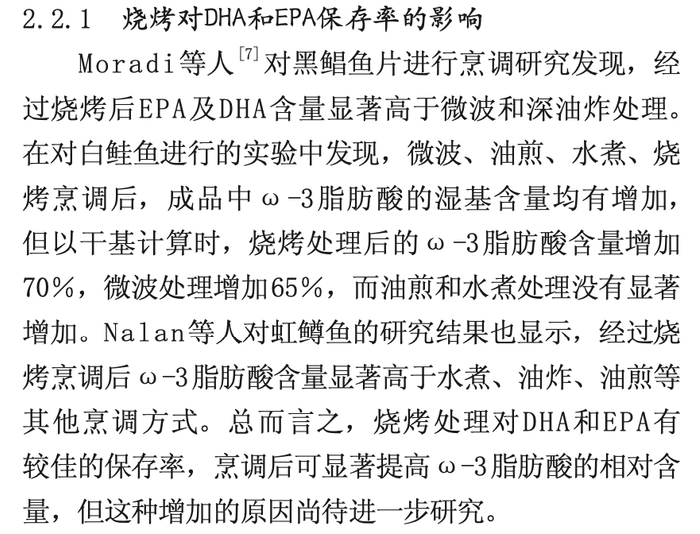 有研究对富含 DHA 的三文鱼、虹鳟鱼进行了油煎、水煮、烧烤、微波的烹调,结果成品中的 n-3 系列脂肪酸( DHA 、 EPA 等)都有增加,其中烧烤后 n-3 系列脂肪酸的含量显著高于其他烹调方式[3]。