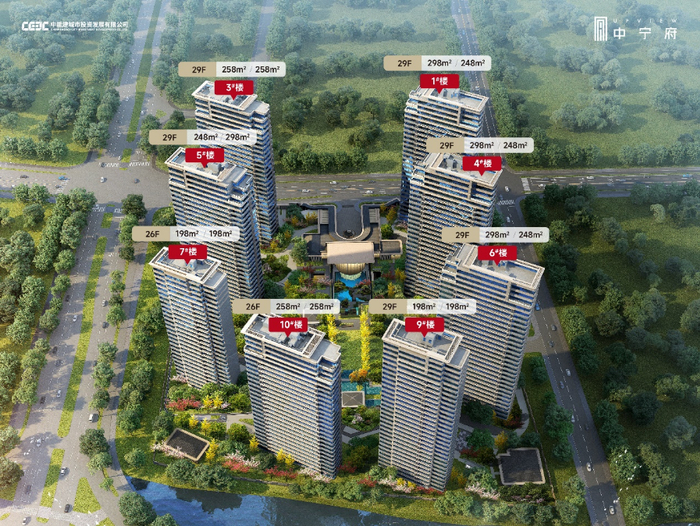 项目总建面约 15.9 万方,由8栋 26-29 层高层组成,呈U型围合式布局。在楼与楼之间的空地引入新加坡森系人居的理念,打造林下活动的宅间花园。以“一轴七进六院”的归家礼序,加上倾斜10°的建设,实现户户观景,保证每一户的隐私与视野。项目建筑方面打造了区域首个巨幕玻璃立面,约270°三面超大景观视野。