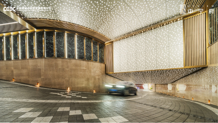 另外,坡道底端处的石材造型端景墙设计,以微景观手法,搭配灯光系统,呼应“泊车归家”的场景体验,让每一次车行归家旅程都赏心悦目、极赋尊贵感。