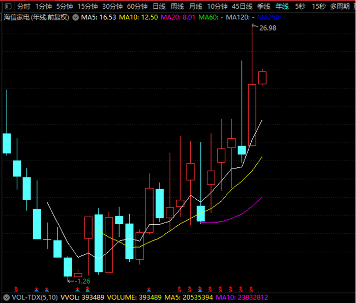 海信家电是近年来的超级大牛股,且表现抗跌。该股2023年逆市大涨超58%,今年年初以来再度大涨超7%。