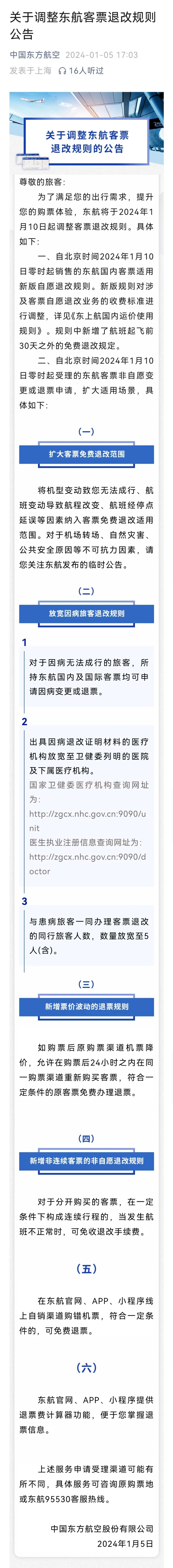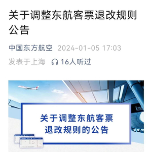 1月5日,中国东方航空发布《关于调整东航客票退改规则的公告》。新规从机票退改收费标准、退改范围及适用场景等方面进行全面调整,生效日期从1月10日零时起。