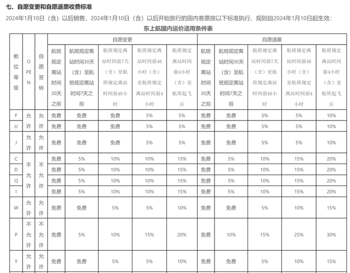 如旅客购票后原购票渠道机票降价,东航允许在购票后24小时之内在同一购票渠道重新购买客票,符合一定条件的原客票免费办理退票。此外,对于分开购买的客票,在一定条件下构成连续行程的,当发生航班不正常时,可免收退改手续费。在东航官网、App、小程序线上自销渠道购错机票,符合一定条件的,也可免费退票。东航表示,新版规则对涉及客票自愿退改业务的收费标准进行了调整,新增航班起飞前30天之外的免费退改规定,详见《东上航国内运价使用规则》。根据官网上最新更新的《自愿变更和自愿退票收费标准》,所有舱位在航班规定离站时间30天之前,皆可退票或者免费变更;起飞前7天到30天之内的,部分舱位免费退票或者改签,部分收取5%~20%的退票费或者5%~10%的改签费;值得注意的是,在航班起飞前4个小时至航班起飞后,退票费的收取标准则从最低10%到最高70%之间不等。根据东航的舱位划分标准:F是头等舱,U是豪华公务舱,J是公务舱。也就是说,相同时间条件下,舱位等级越高,收取自愿退改手续费就越少。