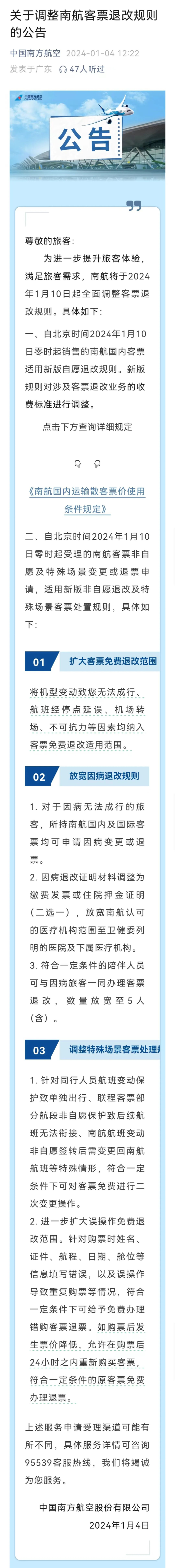 南航率先下调就在东航宣布全面调整退改规则的前一天,1月4日,南方航空率先发布了关于调整南航客票退改规则的公告。公告称,南航也将于2024年1月10日起实施新规。