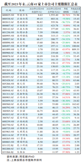 在年度涨跌幅方面,截至2023年12月29日收盘,41家云南上市公司中,在2023年实现上涨的公司有18家,23家公司在2023年出现下跌。