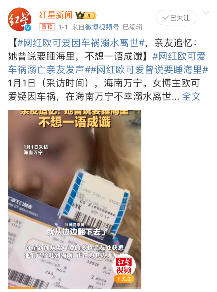 2023年12月29日,“欧可爱”在海南万宁日月湾一个镇里,和很多机车爱好者聚会,并认识了一些朋友。当日5点半左右,一小伙载着“欧可爱”和另外一男一女从聚会处离开,车上几个年轻人都是刚认识的。