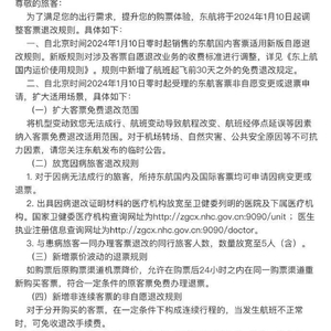 1月5日,中国东方航空发布公告,将于1月10日起调整客票退改规则。规则新增了航班免费退改规定,扩大了东方航空客票非自愿变更或退票申请的适用场景。东方航空是继南方航空后第二家宣布调整客票退改规则的航司。