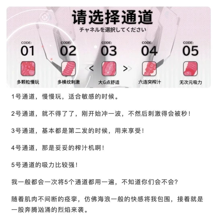 01号属于多颗粒,搅动坤坤,02号,多横纹,体验“峡谷”地带的驰骋,03号通道属于大颗点,拔动你的“牛头”,04号的设计是“六连突”,就像闯关一样,一重更胜一重;05号属于最经典的无次元设计,一击必中的灵魂冲击!