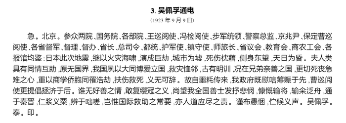 日本东京市及横滨各地,于日前午后突起地震。市廛多被延烧,人民惨罹浩劫,奇灾巨变,亘古未闻,曷胜惊愕。著派驻日本代办代表政府即日亲诣日本外务省慰问,深致惋惜之忱。
