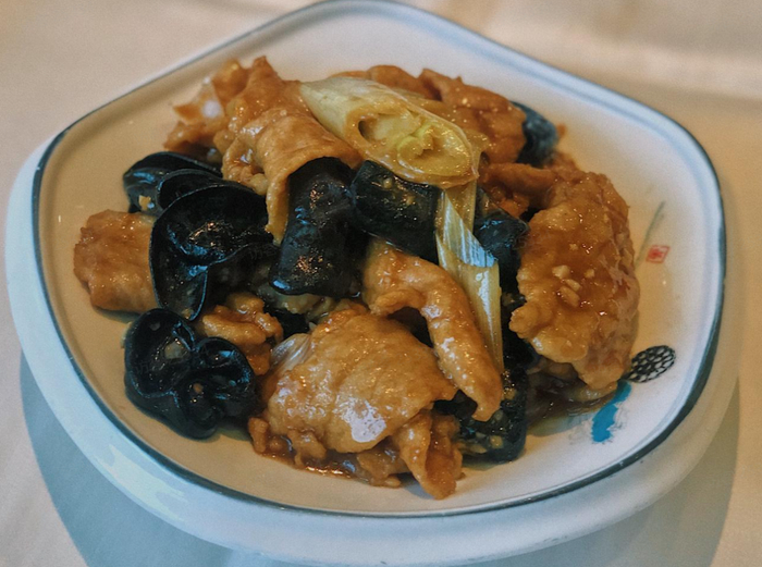 切得薄薄的瘦肉片,腌渍时加入蛋液、料酒、酱油、湿淀粉,上浆后用宽油迅速滑透,配上木耳、蘑菇和笋炒制,出锅时色泽金黄,挂着些许明油,口味咸鲜,再加入山西菜的灵魂——醋,酸味儿若隐若现,一口就能给人香晕了。如果没有吃过正宗的过油肉,当属人生一大憾事。
