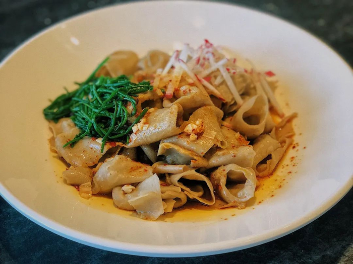 沙葱莜面则是用难得一见的绿色蔬菜沙葱,配上油泼的莜面,入味又有嚼劲,酸爽的感觉让它一度成为西贝莜面村的招牌特色。