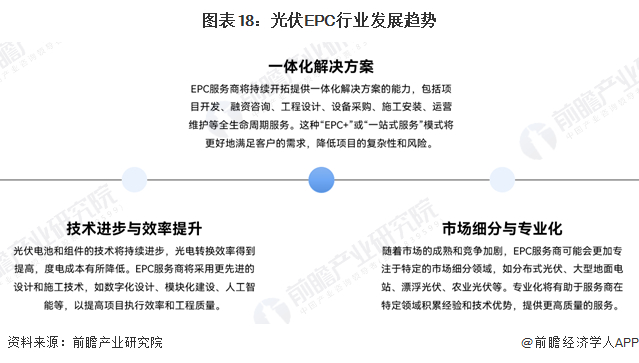 当前,光伏EPC行业在业务运作模式等方面已较为成熟,国家在整县推进加速EPC发展的同时,也为国有企业介入分布式光伏市场创造了条件,同时也带动了合作开发模式下的打包出售、代开发模式。当前,作为光伏电站建设主流模式的光伏EPC,主要面临项目盈利能力差、市场竞争激烈等问题,因此未来光伏EPC行业将朝着成本较低、技术进步以及产品差异化竞争的方向发展,市场细分与服务专业化以及一体化解决方案的提供将成为行业未来业务发展的核心方向。