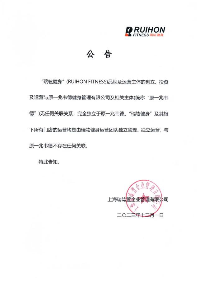 关于瑞竑健身和一兆韦德的关系,上海瑞竑萱企业管理有限公司微信公众号“瑞竑萱服务”在2023年12月5日发布公告称,“瑞竑健身”品牌及运营主体的创立、投资及运营与原一兆韦德健身管理有限公司及相关主体(以下统称为“原一兆韦德”)无任何关联关系,完全独立于原一兆韦德。“瑞竑健身”及其旗下所有门店的运营均是由瑞竑健身运营团队独立管理、独立运营,与原一兆韦德不存在任何关联。