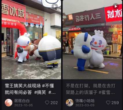 吃到甜头的蜜雪冰城,在IP营销中投入了更多的精力。自此之后,“雪王”成了互联网蹭热点的神——蛋仔派对火了,蜜雪冰城就跟蛋仔联名推出了“雪王”皮肤,在蛋仔广场上也放起了那首魔性的BGM;大家爱看低端商战,“雪王”就在商业街四处溜达,和其他品牌的公仔扯头花打架;东北今年火了,“雪王”又前往东北穿上大花袄、唱起二人转。