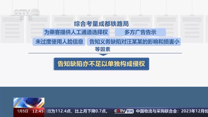 清华大学法学院教授 程啸:我们国家的个人信息保护法,它实际上是以保护个人信息权益和促进个人信息的合理利用为目的目标的。这个案件有一个重要的意义,它明确了取得同意和履行告知义务,这是两个规则。这个案件中铁路部门虽然说进行人脸识别可以不需要取得旅客的同意,但还是应当履行告知义务。