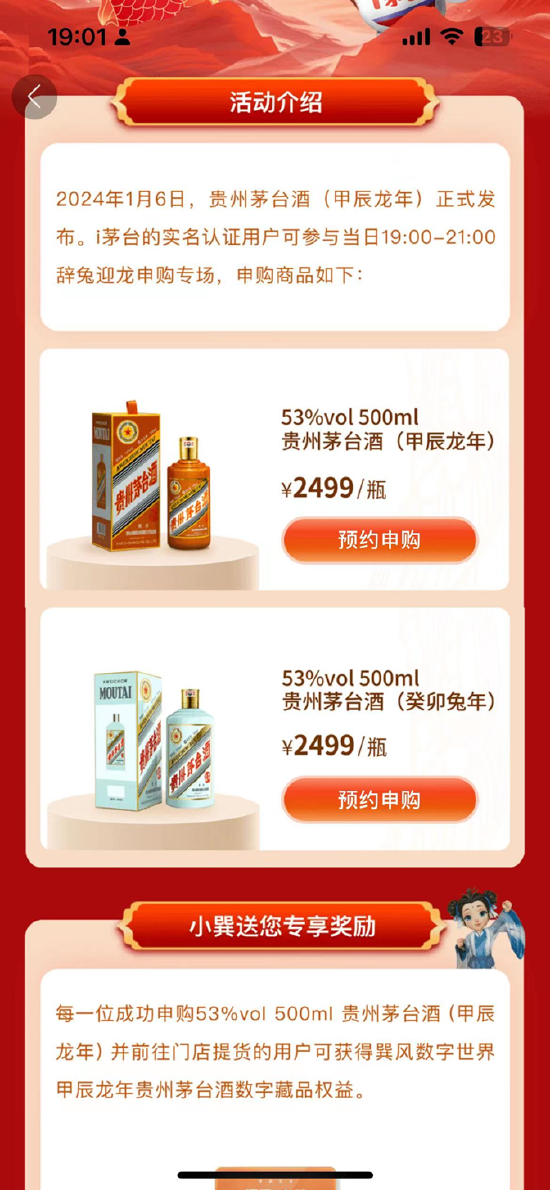 与此同时,6日19:00,“玉兔辞旧·龙腾九霄”辞兔迎龙专场活动也在i茅台开启,在两个小时内投放甲辰龙年贵州茅台酒和癸卯兔年贵州茅台酒各9999瓶,i茅台实名认证用户可进入活动页面进行申购。申购价格为2499元/瓶,价格与兔年茅台持平。申购结果将于1月7日18:00进行公示。活动结束后,癸卯兔年贵州茅台酒将下架i茅台。