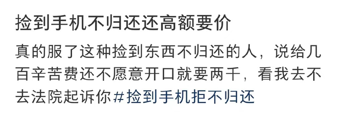 现实生活中,此类事件也并不罕见。如曾有媒体报道“大妈捡到手机,向失主索要500元才归还”“有人捡到手机后向失主索要1000元辛苦费”……法治网记者在社交平台上也发现了不少“丢失物品找回后被索要钱财”的情况。