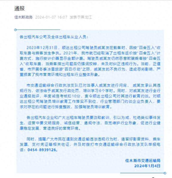 黑龙江佳木斯通报:一出租公司驾驶员恶意欺骗乘客按“四舍五入”收取车费被罚