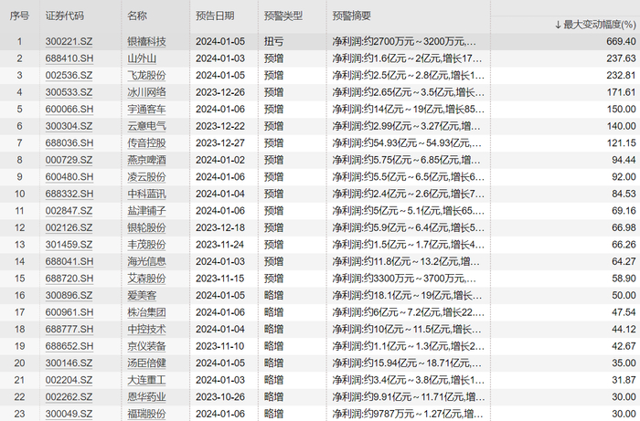 山外山(688410.SH)和飞龙股份(002536.SZ)的2023年净利润预增幅度都超过200%,分别为237.63%、232.81%。此外,冰川网络(300533.SZ)、宇通客车(600066.SH)、云意电气(300304.SZ)和传音控股(688036.SH)等4家公司预计2023年净利润实现翻番。