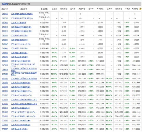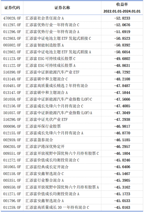 行业观察者“今晚吃基”梳理的表格也显示,近两年来,汇添富基金旗下多只产品亏损幅度超过40%,简直“惨不忍睹”。其中,跌幅最惨的是汇添富社会责任混合A,两年跌超50%。