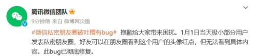 针对微信私密朋友圈 Bug 一事, 腾讯微信团队通过微博发文回应,向用户致歉的同时,强调已彻底修复: