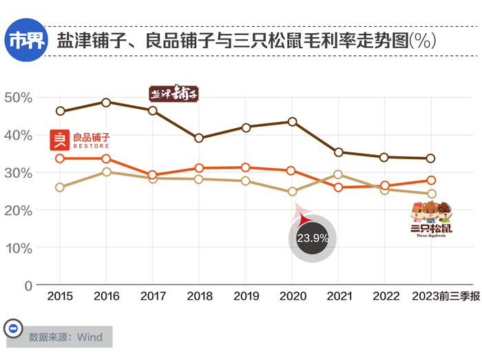 其实,即便是三者中毛利率最高的盐津铺子,也在2020年后出现明显拐点,从43.83%减至35.71%,并依旧呈现不断下滑的趋势,且与良品铺子和三只松鼠间的毛利率差距,也在缩小。