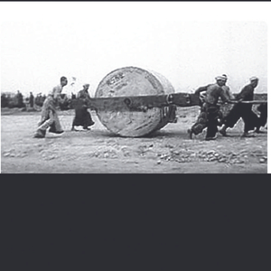 民工们拉着直径两米多的大石碾夯筑机场
