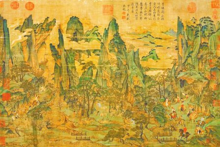 台北故宫博物院所藏唐李昭道所绘《明皇幸蜀图》描绘了安史之乱时唐玄宗逃往成都避乱的情景。 图据文博山西