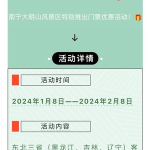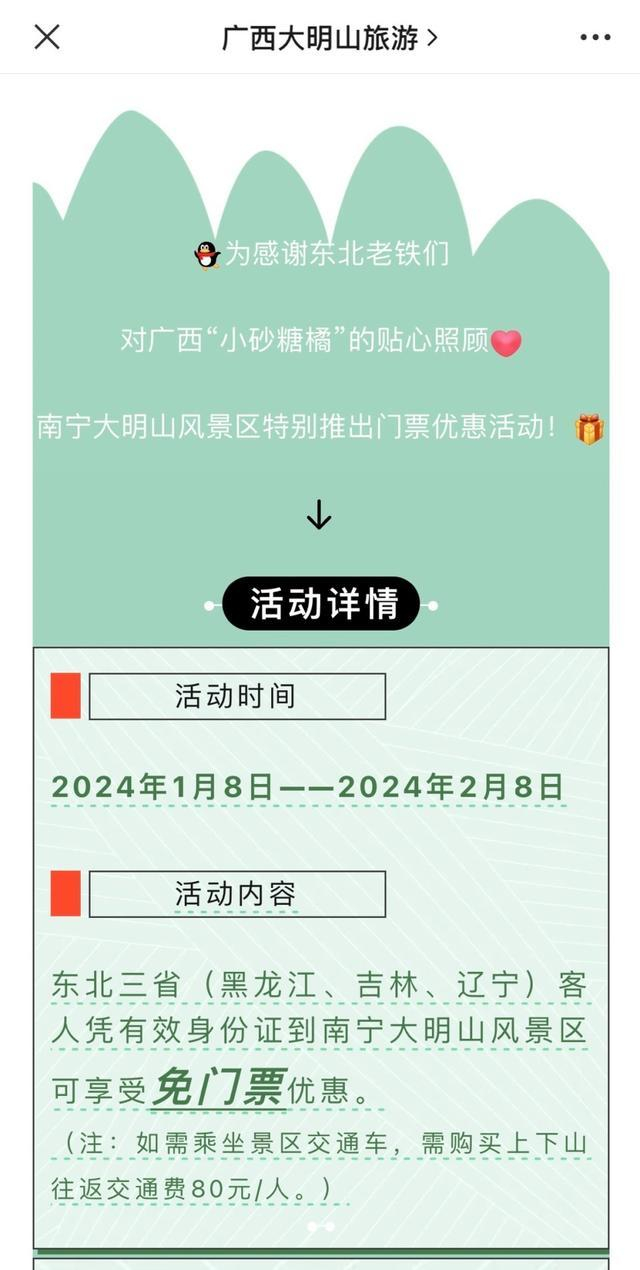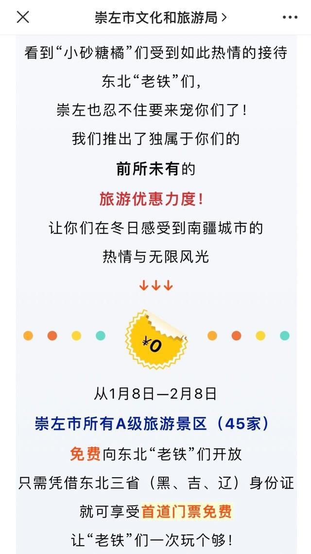为感谢东北老铁对“小砂糖橘”的贴心照顾,1月8日至2月8日,南宁大明山风景区对东北三省游客实行免门票优惠;广西崇左市文化和旅游局方面称,1月8日至2月8日,崇左市所有A级旅游景区(45家)将免费向东北游客开放,只需凭借东北三省(黑、吉、辽)身份证,就可享受首道门票免费。
