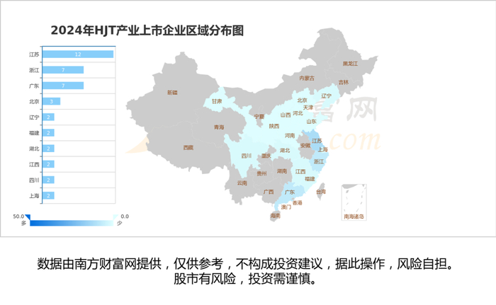 从上市企业分布情况来看,A股48家HJT相关上市企业分布在江苏、广东、浙江、北京、上海等省市,总体来看企业主要集中于华东区域。