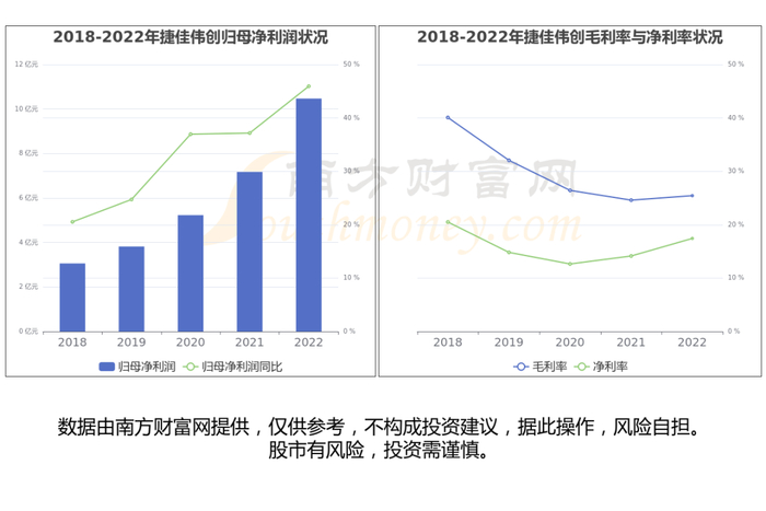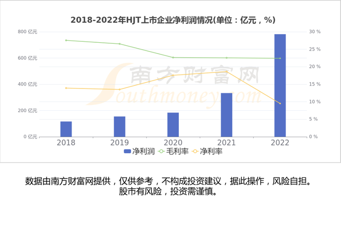 南方财富网趋势选股系统数据显示,2022年A股48家HJT相关上市公司总体归母净利润为781.8亿元,同比增加134.87%,高于2021年水平。从HJT行业利润率来看,2022年平均毛利率22.42%,较2021年有所下滑,平均净利率9.51%,较2021年有所下滑。