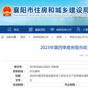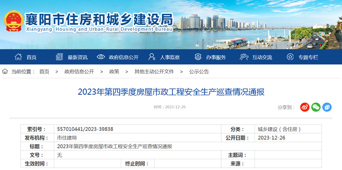 湖北省襄阳市2023年第四季度房屋市政工程安全生产巡查情况通报