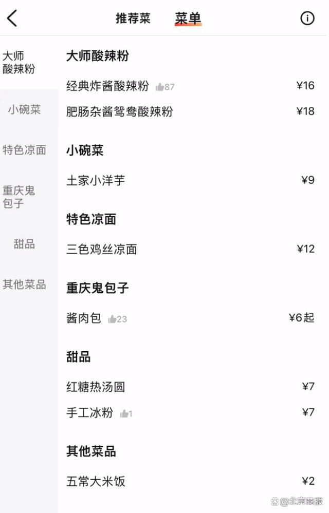 有别于此前开设的麻六记餐厅,麻六记酸辣粉主打各种粉面小吃。除了麻六记经典酸辣粉外,还有地道成都小吃。大众点评显示,一碗经典炸酱酸辣粉16元。菜品上,除了酸辣粉外,还有售卖一些地方小吃,售价在7—16元之间。基本上,人均消费在15元左右。