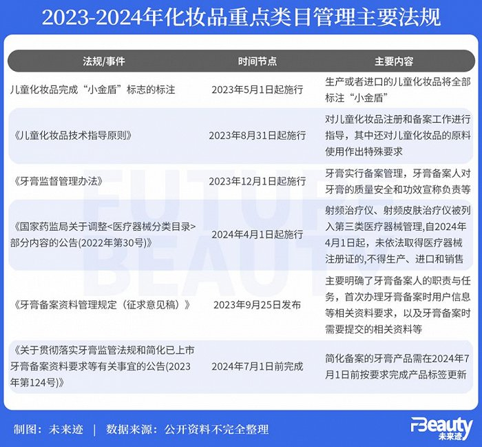 过去两年,国家发布或正式实施了多款化妆品相关法律法规。包括“一号多用”、功效宣称等痛点领域。此外,专门面向电商平台的《化妆品网络经营监督管理方法》也于2023年9月1日开始实行。在细分品类上,儿童化妆品、美容仪、牙膏也相继迎来监管细则,多项重要法规将于2024年正式执行。