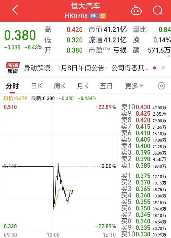 1月8日下午,恒大汽车复牌,股价一度跌至0.32港元,跌近23%,随后有所回暖,截至下午2时许,恒大汽车股价下跌8.43%至0.38港元,总市值为41.21亿元。