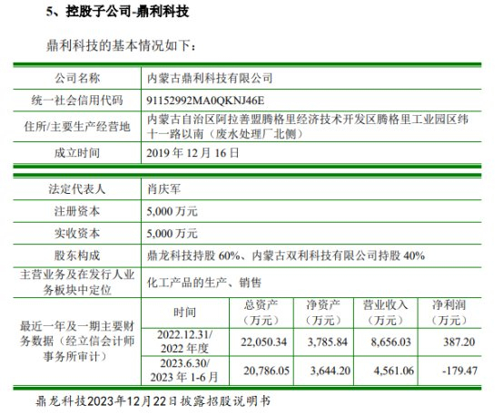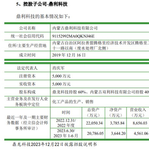 鼎龙科技2023年12月22日披露的招股书显示,公司于2019年底在内蒙古设立了子公司鼎利科技,并于2022年初开始试生产。