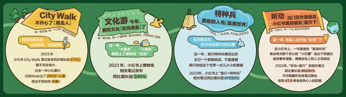 1月7日,小红书发布了《2023 年度旅行趋势报告》,citywalk、文化游、特种兵、听劝等成为了小红书2023年年度旅行趋势。