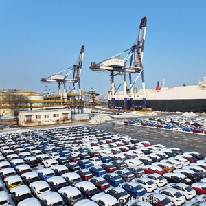 靠泊在山东港口烟台港38泊位的“东京车船”轮正在进行商品车装船作业。(图片由CNSPHOTO提供)