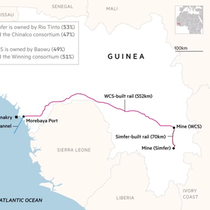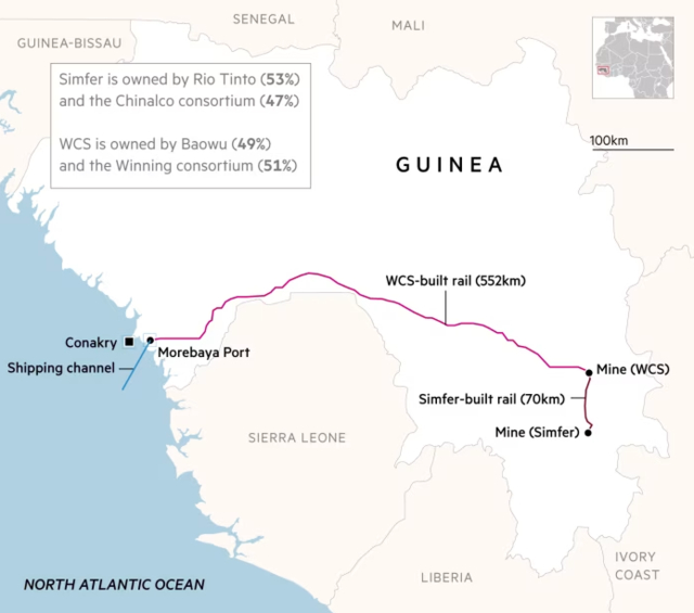 据媒体报道,在该项目中,除了采矿业务以外,合作各方将共同出资修建一条几内亚内陆-大西洋的铁路,长约552公里,各方还拟将在大西洋沿岸开发一个深水港。