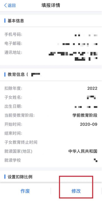 温馨提示:“作废”表示本人相关年度不再享受该项专项附加扣除,由其他共同填报人享受。“修改”——“修改设置扣除比例”表示与共同填报人共同分摊享受专项附加扣除,但需要确保双方合计填报不超过100%。