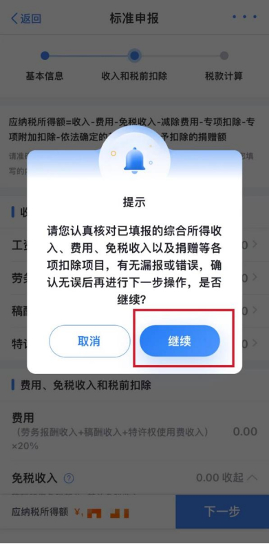 进入“标准申报”界面,连续点击【下一步】,直至出现“提示”,点击【继续】完成申报,如因前期误填报导致更正后涉及补缴税款及滞纳金的,应同步补缴税款及滞纳金。