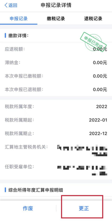 进入“申报记录详情”界面,点击【更正】并完成对应年度汇算更正申报。