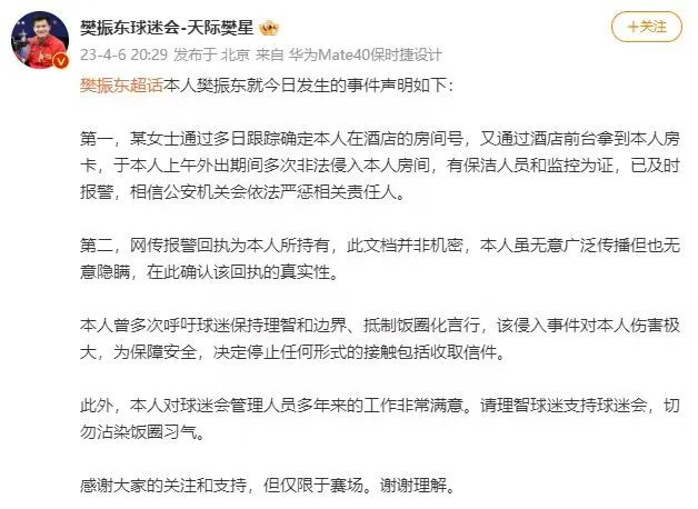 近日,有一些不请自来的朋友跑到我家里拍摄我的父母,打扰他们的生活,这种行为让我和家人十分苦恼。在这里,我恳切地希望大家不要打扰我的家人,也不要中伤我的同事。我非常感谢大家对我的关心和爱护,愿一直与星辰同行,期待我们未来能在更多的公开场合和谐愉快地相见。