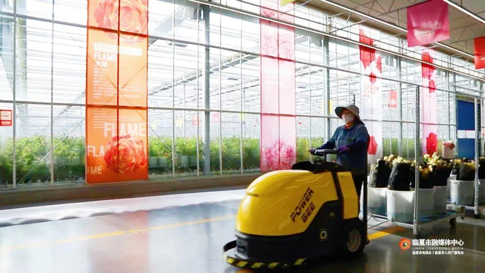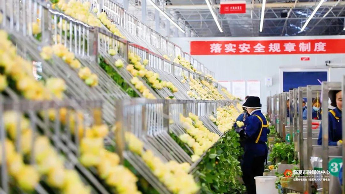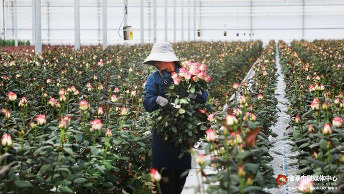 “眼下虽是数九寒天,但在临夏百益亿农国际鲜花港内春意盎然,粉红雪山、艾莎、娜欧蜜等各色品种的鲜切玫瑰竞相绽放,工人们正在忙着采摘、分装、打包、存储,到处是一派火热的繁忙景象。”