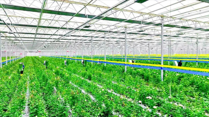 棚内一株株饱满艳丽的玫瑰花蕾含苞待放。工人们各司其职,有的两人一组穿梭于花田间熟练地切花,有的在冷库车间旁忙着修枝、分拣、清洗、杀菌、包装、冷藏,多个环节之后,这批新鲜的玫瑰花当天被发往全国各地,第二天将到达客户手中。工人们告诉记者,工作量大工资就高,虽然每天很忙,但大家都干劲满满。