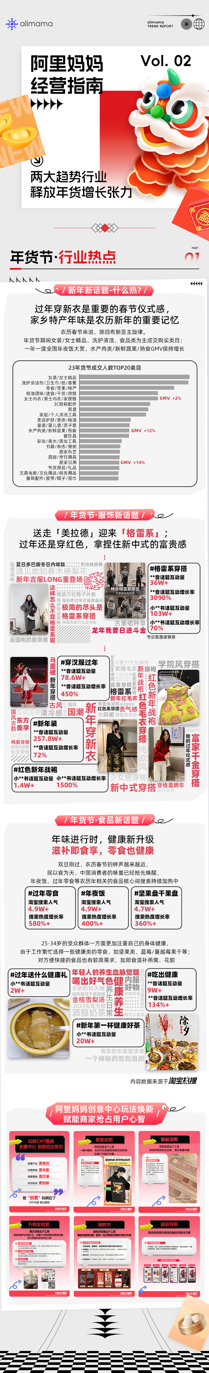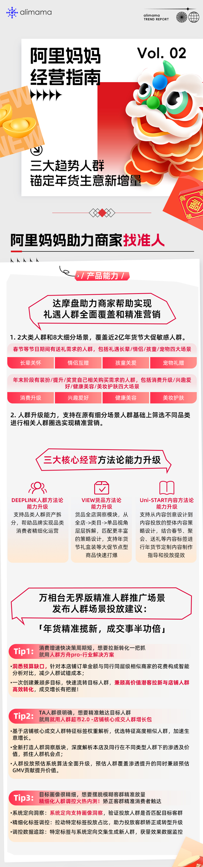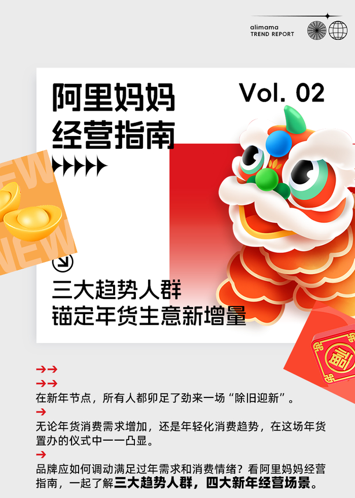 针对此,阿里妈妈联合淘宝热搜发布《阿里妈妈经营指南》Vol.02,观察年货经营趋势,对新年年货节核心人群、趋势场景和行业做出深度解读,帮助品牌把握年货节机遇,助力夺得2024第一波“开门红”。