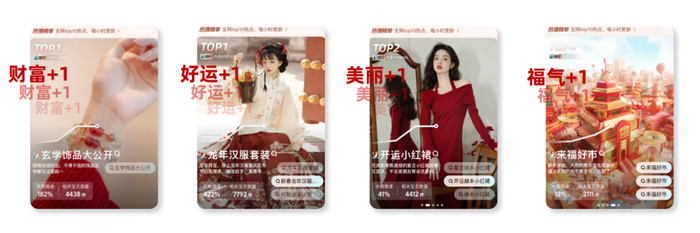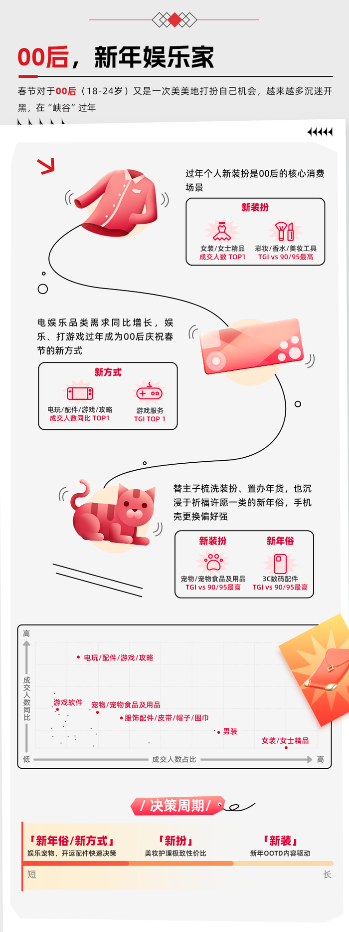譬如,过年新装扮中的服饰品类由内容驱动比较明显,美妆护理则受极致性价比驱动较强,而新年娱乐、宠物装扮、开运配件、祈福小配件等则容易快速决策。与之相反,食品饮料的决策周期较长,过年亲子装、家居仪式感布局等则来自精心挑选的结果,决策周期更长。针对此,商家可以根据品类特点和决策周期进行有针对性的蓄水和转化。