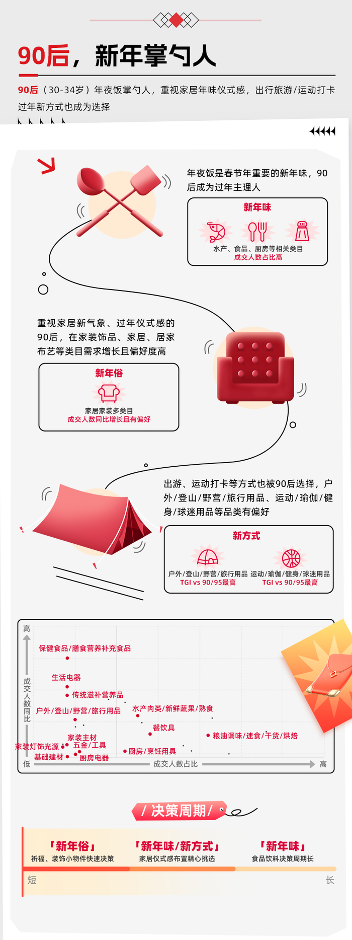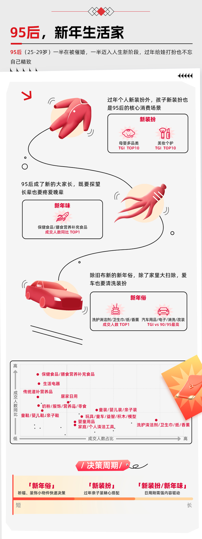 95后们也在建立家庭新秩序,安排家中大扫除,为爱车来个年度焕新,在年货节期间带动汽车用品、改装品类的需求增长。看望亲人也成了过年最重要的事,这也带动了节日礼品、传统滋补营养品、玩具等礼赠场景的消费。