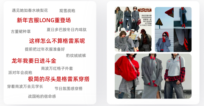服饰赛道仍在持续孵化新的爆点。秋日刮起的美拉德风热度还未褪去,冬日以灰色为主场的“格雷系”已经登场。叠加新年永恒的经典色正红,时髦灰与中国红两色碰撞,让服饰赛道呈现特别的生命力。