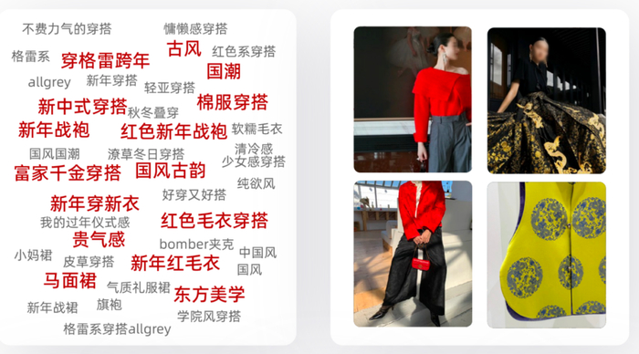 2023年以来,冲锋衣、军大衣、马面裙、滑雪服、鲨鱼裤等不断掀起新的潮流。而恰逢金龙之年,红色毛衣、红色新年战袍持续吸引注意力的同时,金龙纹马面裙、团龙纹、金龙中式棉服等风格也被追捧。