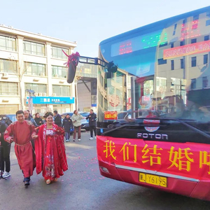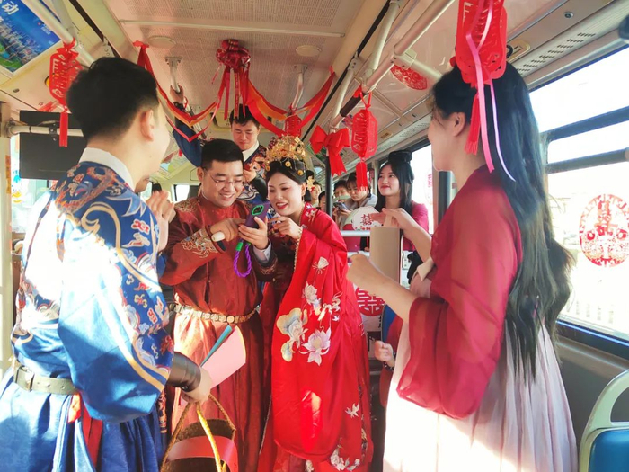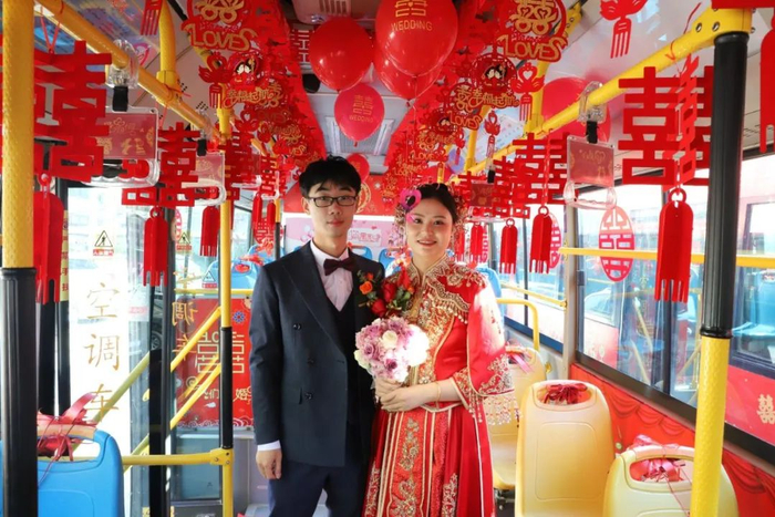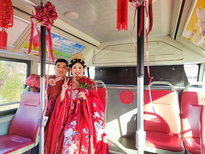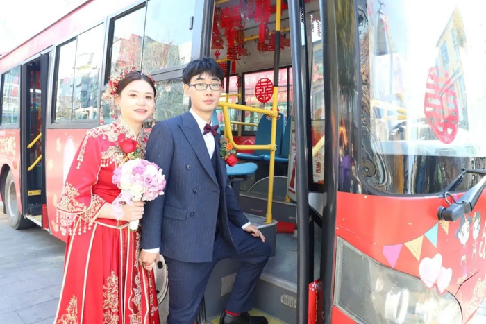 伴随着阵阵笑语欢声,新郎新娘在众多亲朋好友的陪伴下,一起登上这辆“浪漫婚车”,驶向名为“幸福”的下一站。两位新人表示:“公交车车厢空间大、载客量多,还可以进行个性化布置,同时能让家人朋友共享这段浪漫旅途的喜悦,共同见证这一幸福瞬间,更有仪式感与氛围感。”